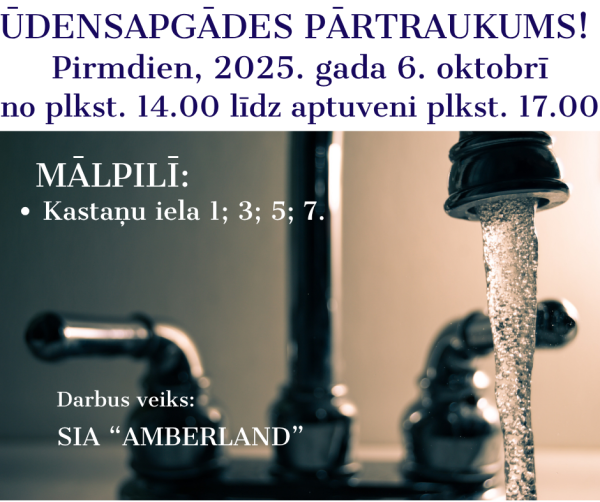 Pirmdien, 6. oktobrī, pārtrauks ūdensapgādi atsevišķiem nekustamajiem īpašumiem Kastaņu ielā, Mālpilī!