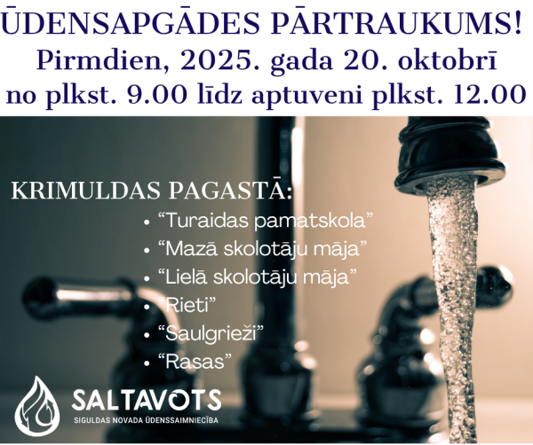 Pirmdien, 20. oktobrī, pārtrauks ūdensapgādi visiem nekustamajiem īpašumiem, kas atrodas Turaidas skolas apkārtnē!
