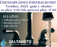 Trešdien, 1. oktobrī, pārtrauks ūdensapgādi atsevišķiem nekustamajiem īpašumiem Allažos!