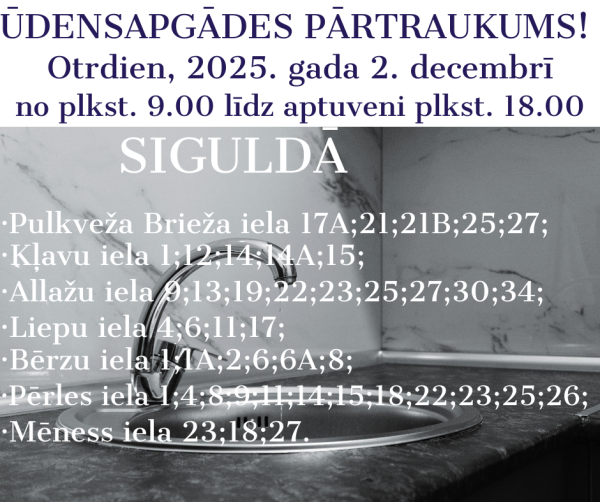 Avāriju gadījumos ārējos ūdensvada un kanalizācijas tīklos (visu diennakti) zvanīt: